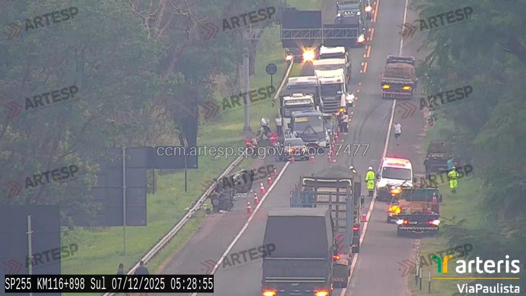 Com o impacto, o Uno ficou imobilizado entre a faixa de rolamento e o acostamento do sentido Sul, enquanto a F-4000 parou na área de domínio do lado Norte. Já o Scania permaneceu parcialmente sobre a pista Norte.