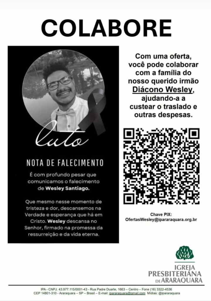 A Igreja Presbiteriana de Araraquara está promovendo uma arrecadação solidária para a família do jovem Wesley Sousa Santiago. A iniciativa tem por objetivo ajudar a família a fazer o traslado do corpo do rapaz e outras despesas. Infelizmente, ele morreu num acidente na Argentina envolvendo sua motocicleta e outro veículo.