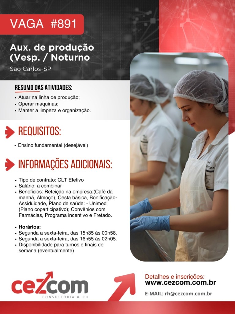 As vagas de auxiliar de produção são para os períodos tarde e noite, com horários disponíveis das 15h35 às 0h58 e das 16h55 às 2h05, de segunda a sexta-feira.