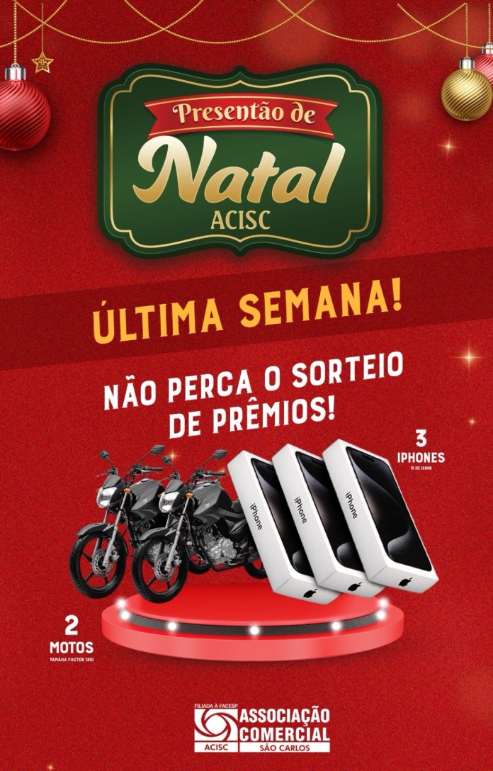 Sorteio das motos e iphones acontece no dia 08 de janeiro de 2025, às 10h, na sede da ACISC