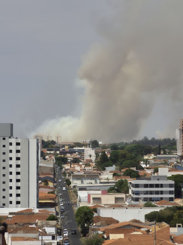 Uma grande coluna de fumaça toma conta do céu de São Carlos na tarde desta sexta, 3. A imagem foi enviada à redação pela leitora Michelle. A reportagem acompanha para saber o local exato do incêndio.