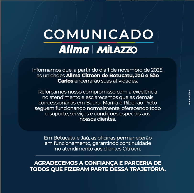 O grupo Allma Milazzo comunicou que as concessionárias Allma Citroën localizadas em Botucatu, Jaú e São Carlos encerraram suas atividades desde do dia 1º de novembro de 2025. A empresa destacou que a decisão faz parte de um processo de reestruturação interna e reafirmou seu compromisso com a qualidade no atendimento aos clientes. Em São Carlos, a Peugeot també funcionava em conjunto.