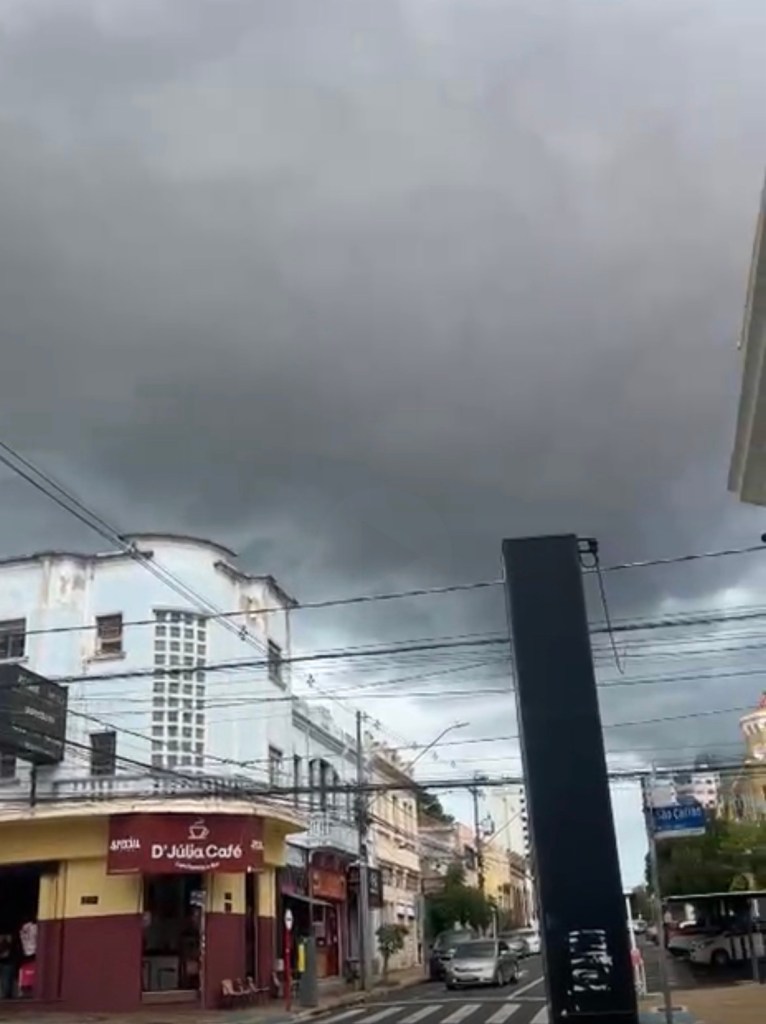 O centro de São Carlos registrou uma mudança brusca no tempo na tarde desta terça-feira (27), quando o céu ficou carregado e o dia “virou noite”, indicando a aproximação de uma área de chuva que já se formava há algumas horas na região.