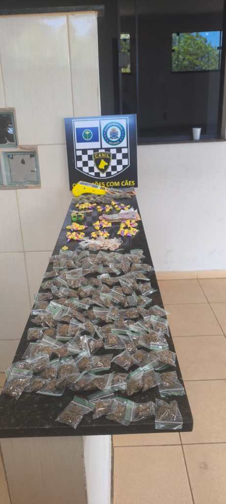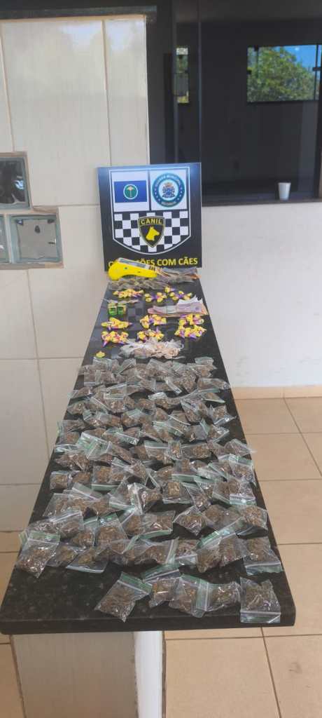 Com o apoio do cão de faro K9 Índia, os agentes realizaram varredura em um terreno próximo, onde foi encontrada uma sacola contendo R$ 215 em espécie, quatro porções de substância conhecida como “ICE”, 61 eppendorfs com material análogo à cocaína, 53 pedras semelhantes a crack e 115 invólucros com substância aparentando ser maconha.