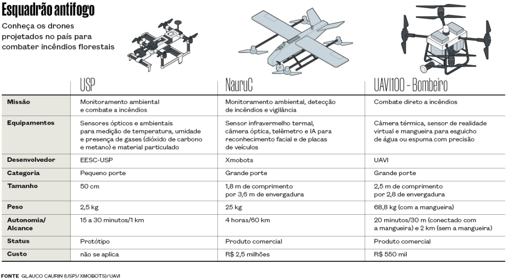 Aeronaves não tripuladas de múltiplos usos, os drones vêm sendo empregados em missões de monitoramento, detecção e combate a incêndios em vários países. Modelos em sua maioria importados são usados por órgãos de defesa civil de estados e municípios brasileiros. Os resultados obtidos em campo têm motivado o desenvolvimento de inovações e versões nacionais desses equipamentos. Na Universidade de São Paulo (USP), campus de São Carlos, está em curso o projeto de um drone que usa sensores e sistemas de inteligência artificial (IA) para medir a concentração de gases de efeito estufa (GEE) a fim de monitorar condições ambientais de áreas de matas e florestas e identificar focos de incêndio. As empresas paulistas Xmobots, também de São Carlos, e Indústria de Aeronaves Remotamente Pilotadas (UAVI), de São José dos Campos, interior paulista, colocaram drones anti-incêndio no mercado.