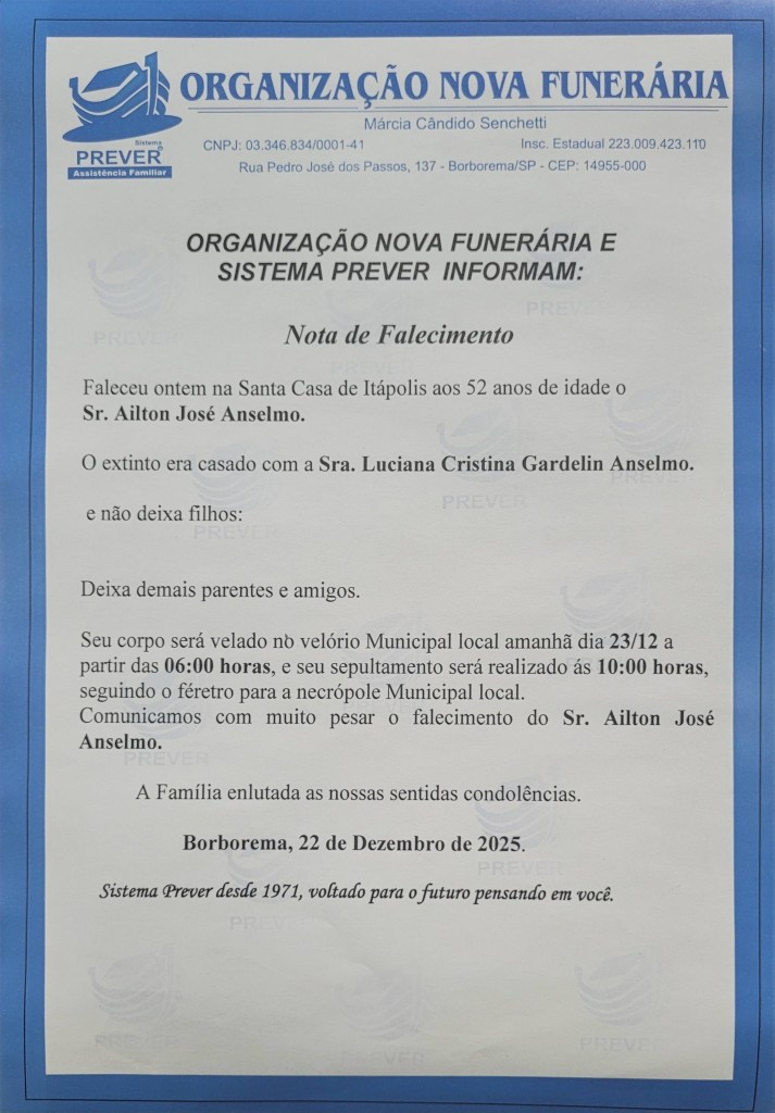 A Santa Casa de Itápolis comunica, com profundo pesar, o falecimento de Ailton (Ailton José Anselmo, 52 anos), técnico de enfermagem que por mais de 20 anos dedicou sua vida ao cuidado do próximo, exercendo sua profissão com amor, responsabilidade e humanidade.