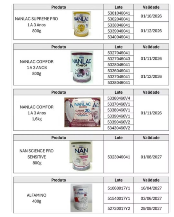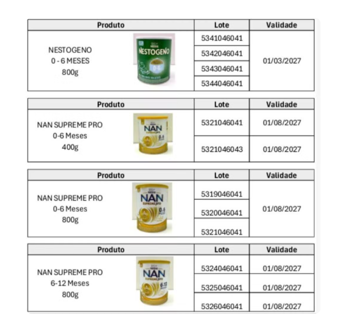 A decisão atinge produtos das marcas Nestogeno, Nan Supreme Pro, Nanlac Supreme Pro, Nanlac Comfor, Nan Sensitive e Alfamino. A comercialização, distribuição e uso desses lotes ficam suspensos até nova deliberação da agência reguladora.