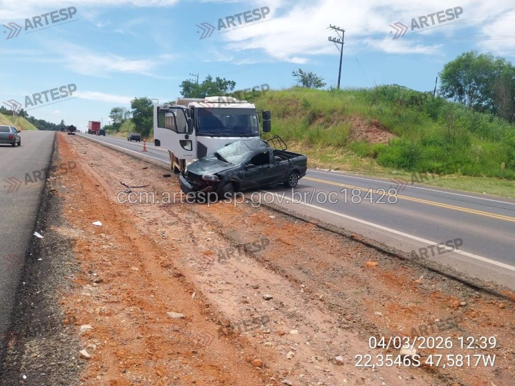 Segundo consta, houve a colisão transversal entre um Ford Cargo e um Fiat Strada. A batida foi forte e o sistema Pare e Siga precisou ser adotado.