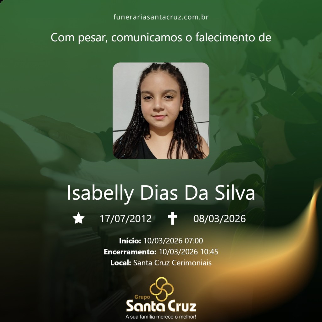 É com grande pesar que o Grupo Santa Cruz comunica o falecimento da jovem Isabelly Dias da Silva, aos 13 anos de idade, ocorrido no dia 08 de março de 2026, na cidade de São Carlos.