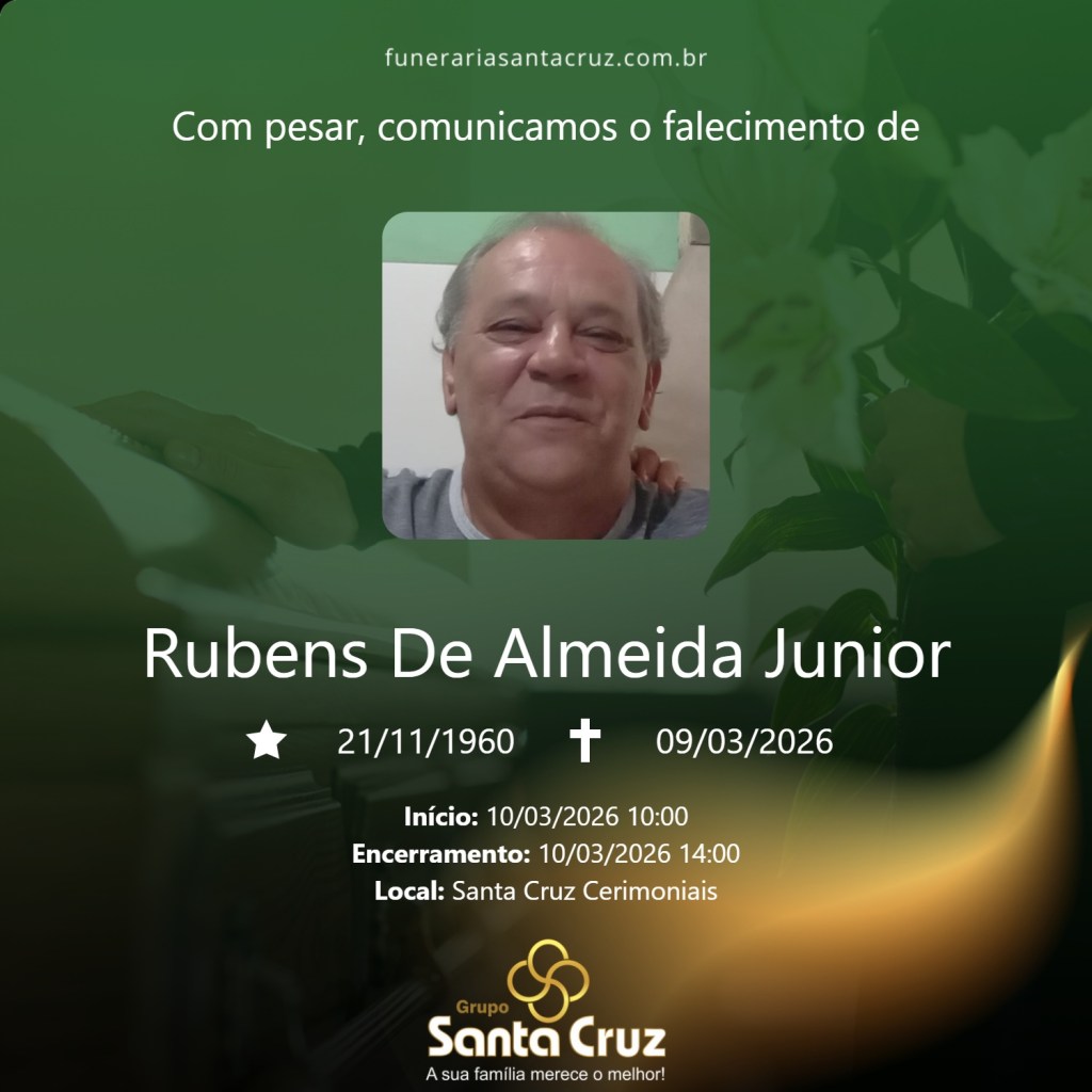 É com grande pesar que o Grupo Santa Cruz comunica o falecimento do Sr. Rubens de Almeida Júnior, aos 65 anos de idade, ocorrido no dia 09 de março de 2026, na cidade de São Carlos.