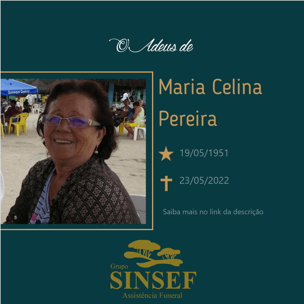 O Grupo Sinsef se despede da Sra. Maria Celina Pereira de Oliveira, que nos deixa completando 71 primaveras. Deixa seu esposo, filhos, familiares e amigos que o acompanharam nesta linda jornada aqui na Terra.