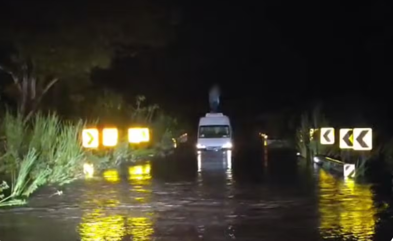 Com o nível da água elevado, a ponte ficou completamente alagada, dificultando a passagem de veículos e oferecendo riscos para quem tentava atravessar o trecho.