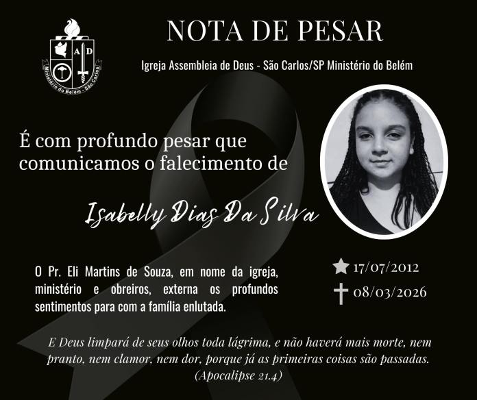 Com profundo pesar em nossos corações, comunicamos, com autorização da família, o falecimento de nossa estimada irmã Isabelly Dias da Silva, que congregava na Assembleia de Deus – Ministério do Belém, no bairro Eduardo Abdelnur, em São Carlos/SP.