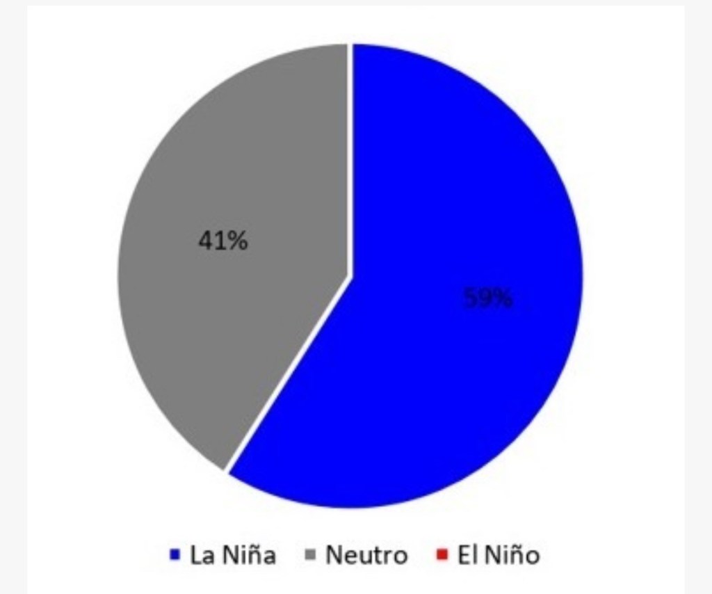 A persistência dessas anomalias (diferença entre o valor observado e a média) por três meses consecutivos, caracteriza o fenômeno La Niña. A previsão é de que o fenômeno persista durante o trimestre fevereiro-março-abril de 2025, com 59% de probabilidade (Figura 1).