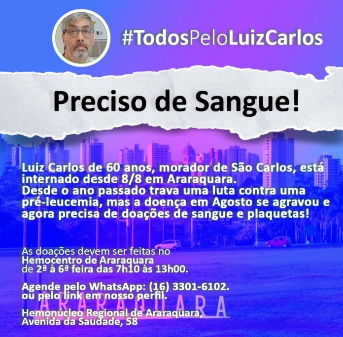 Ele enfrenta uma pré-leucemia desde o ano passado e, com o agravamento da doença em agosto, precisa urgentemente de doações de sangue e plaquetas.