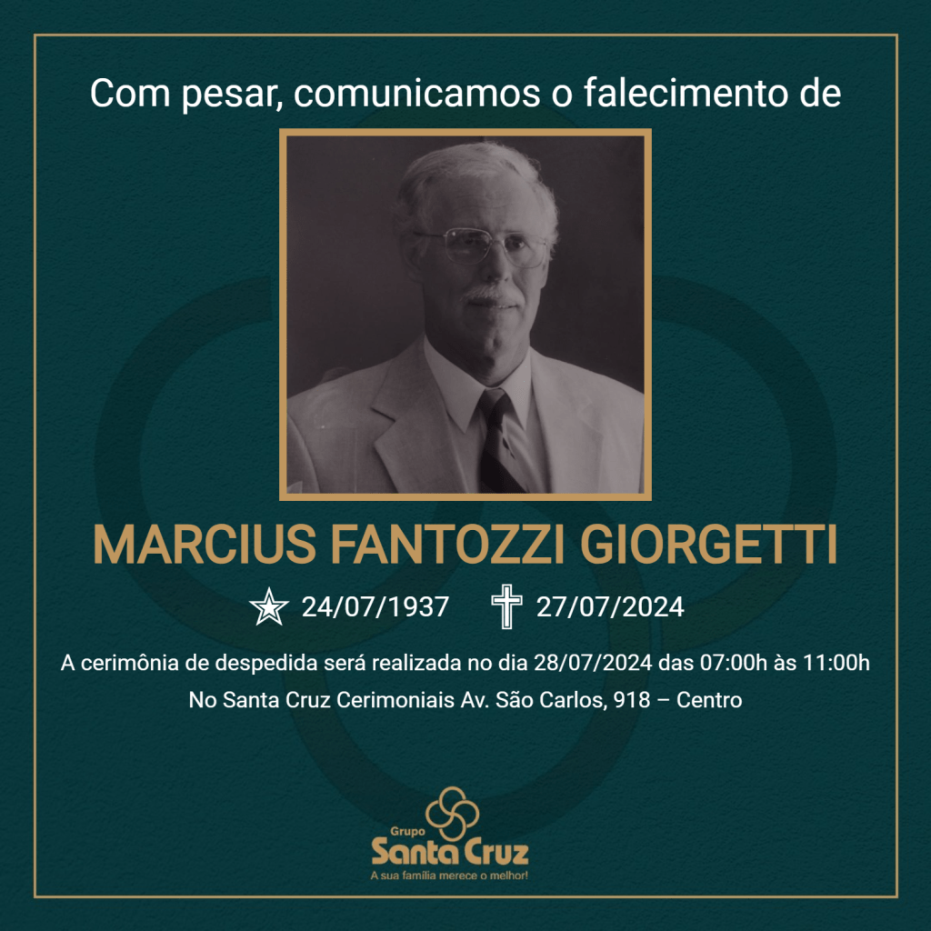 É com grande pesar que o Grupo Santa Cruz informa o falecimento do Sr. Marcius Fantozzi Giorgetti aos 87 anos, ocorrido no dia 27/07/2024, na cidade de São Paulo.