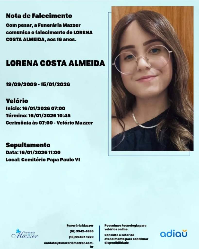 Notícias O falecimento, aos 16 anos, de Lorena Costa Almeida Por renatochimirri - 15 de janeiro de 2026 Share Facebook Twitter Pinterest WhatsApp Com pesar, a Funerária Mazzer comunica o falecimento de LORENA COSTA ALMEIDA, aos 16 anos. Nossos sinceros sentimentos a família e amigos.