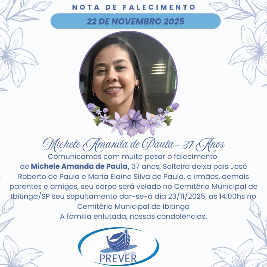 Com profundo pesar, a família comunica o falecimento de Michele Amanda de Paula, aos 37 anos. Solteira, Michele deixa seus pais, José Roberto de Paula e Maria Elaine Silva de Paula, além de irmãos, demais familiares e amigos que hoje lamentam sua partida.