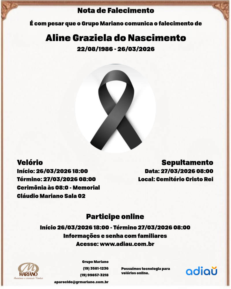 A Funerária Grupo Mariano (Santa Catarina), com profundo pesar, comunica o falecimento de Aline Graziela do Nascimento, ocorrido em 26 de março de 2026, aos 39 anos de idade.