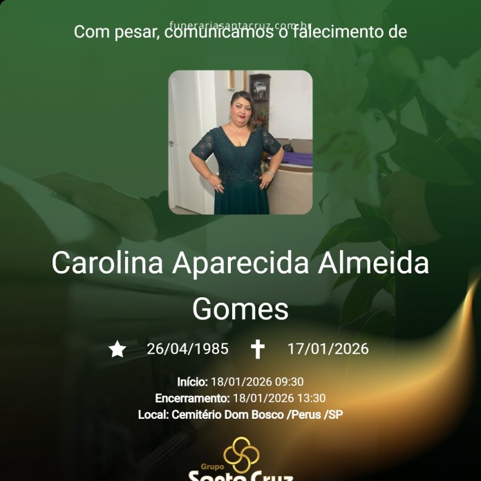 É com grande pesar que o Grupo Santa Cruz comunica o falecimento da Sra. Carolina Aparecida Almeida Gomes, aos 40 anos de idade, ocorrido no dia 17/01/2026, na cidade de São Carlos.