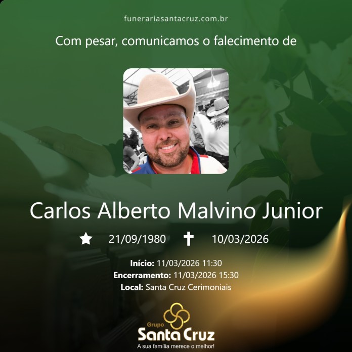 É com grande pesar que o Grupo Santa Cruz informa o falecimento do Sr. Carlos Alberto Malvino Júnior, aos 45 anos de idade, ocorrido no dia 10/03/2026, na cidade de São Carlos.