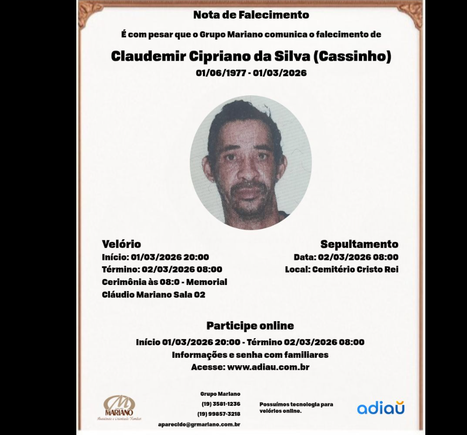 O Sr. Claudemir será velado hoje, 01/03/2026, na sala 02 do Velório Santa Catarina – Memorial Claudio Mariano, à Rua Coronel João Procópio, 775, Centro – Porto Ferreira.