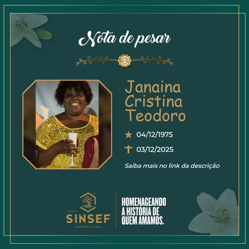 A família de Janaína Cristina Teodoro comunica seu falecimento e convida amigos e conhecidos para a despedida. A homenagem será realizada no dia 04/12/2025, no Memorial Sinsef – São Carlos, com início às 10h e término às 14h. Após a cerimônia, o cortejo seguirá para o Cemitério Santo Antônio de Pádua, onde o sepultamento acontecerá às 14h30.
