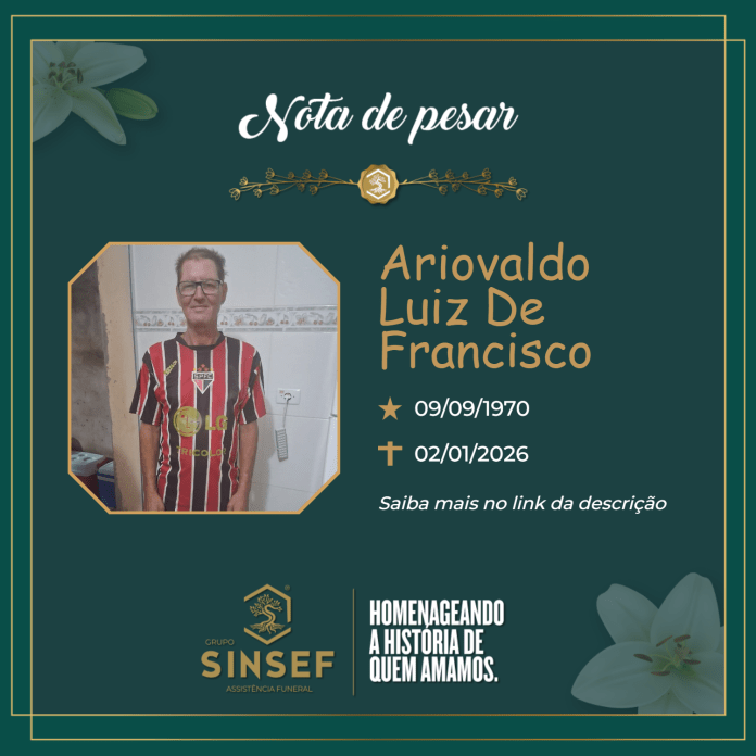 A família de Ariovaldo Luiz de Francisco comunica, com pesar, o seu falecimento. O Grupo SINSEF teve a honra de prestar a última homenagem no dia 03/01/2026.