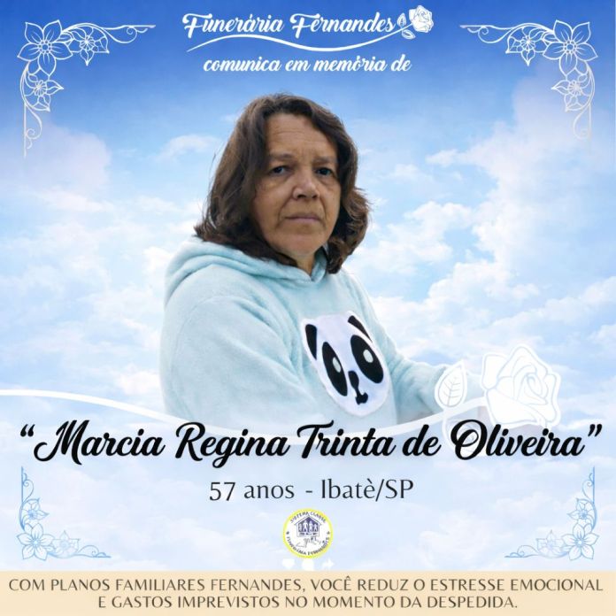 É com grande pesar que a Funerária Fernandes comunica o falecimento da Sra. Marcia Regina Trinta de Oliveira, aos 57 anos, ocorrido no dia 05/03/2026, em Ibaté (SP).