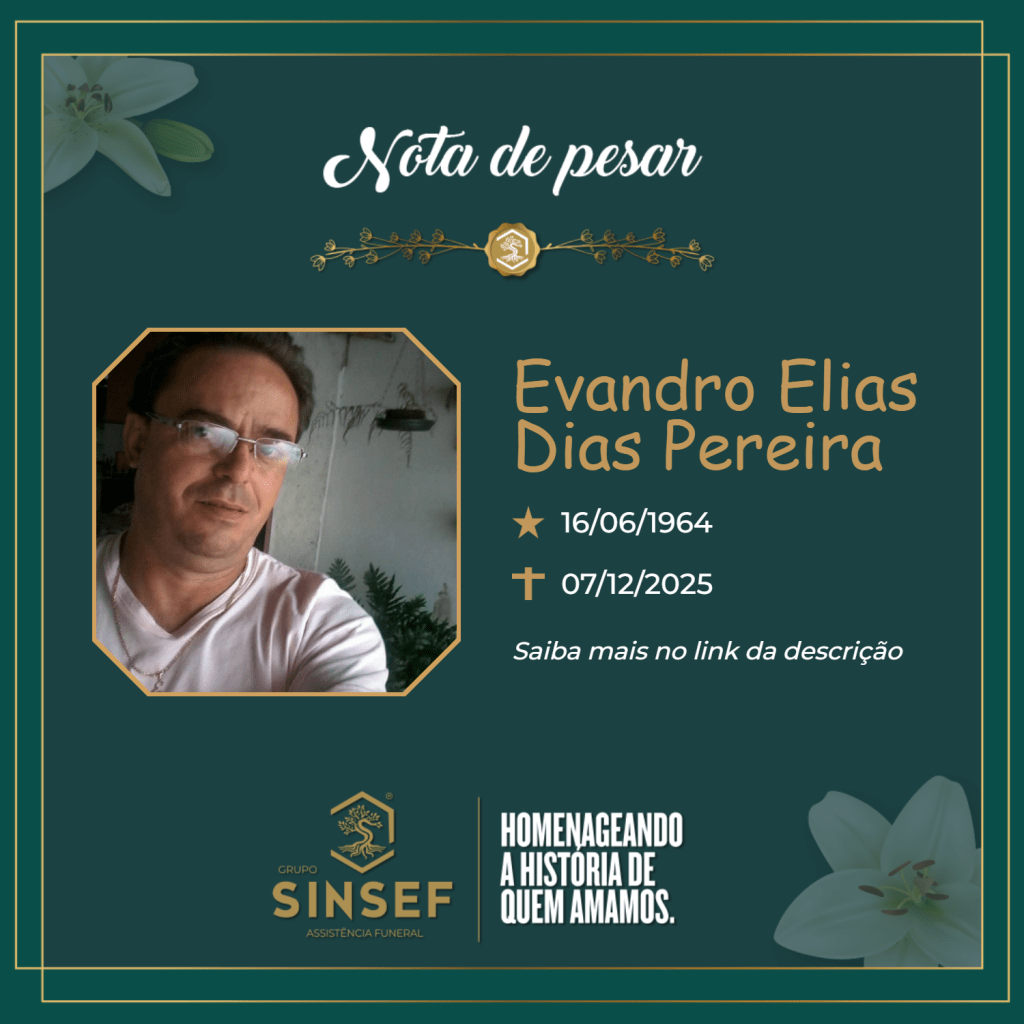 A família de Evandro Elias Dias Pereira comunica a todos sua despedida. O Grupo SINSEF terá a honra de realizar sua última homenagem no dia 08/12/2025, no Memorial SINSEF – Araraquara, com início às 13h e encerramento às 16h15. Após a cerimônia, o cortejo seguirá para o Cemitério São Bento, onde ocorrerá o sepultamento às 16h30. A todos que partilharam com ele os caminhos da vida, entre alegrias e desafios, fica o mais sincero agradecimento.