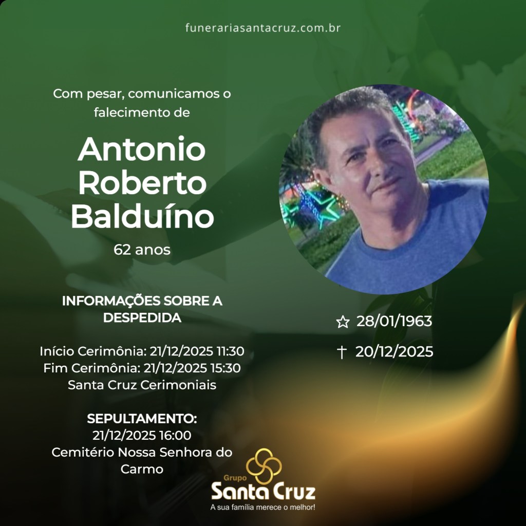 É com grande pesar que o Grupo Santa Cruz comunica o falecimento do Sr. Antônio Roberto Balduíno, aos 62 anos, ocorrido no dia 20 de dezembro de 2025, na cidade de São Carlos.