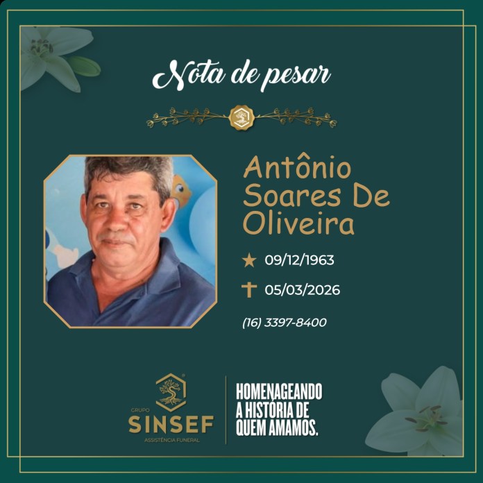 A família de Antônio Soares Oliveira comunica, com pesar, o seu falecimento e convida parentes e amigos para sua despedida.