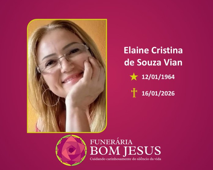 Com profundo pesar, comunicamos o falecimento de Elaine Cristina de Souza Vian, nascida em 12/01/1964 e falecida em 16/01/2026, aos 62 anos.