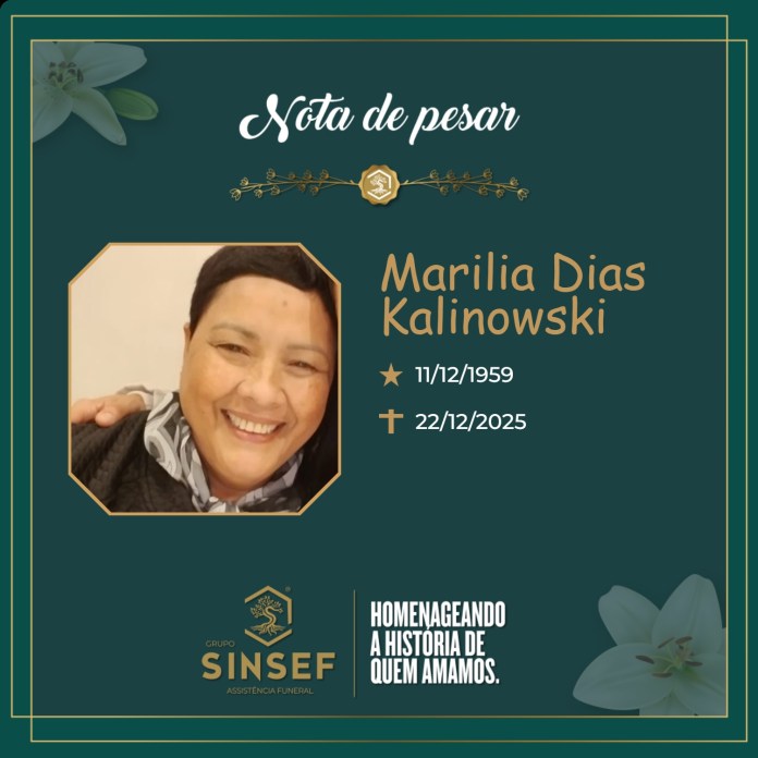 A família de Marília Dias Kalinowski comunica, com profundo pesar, o seu falecimento. O Grupo SINSEF terá a honra de realizar a última homenagem no dia 23/12/2025, no Memorial SINSEF – São Carlos, com início às 12h e encerramento às 16h. Após a cerimônia, o cortejo seguirá para o Crematório de Piracicaba.