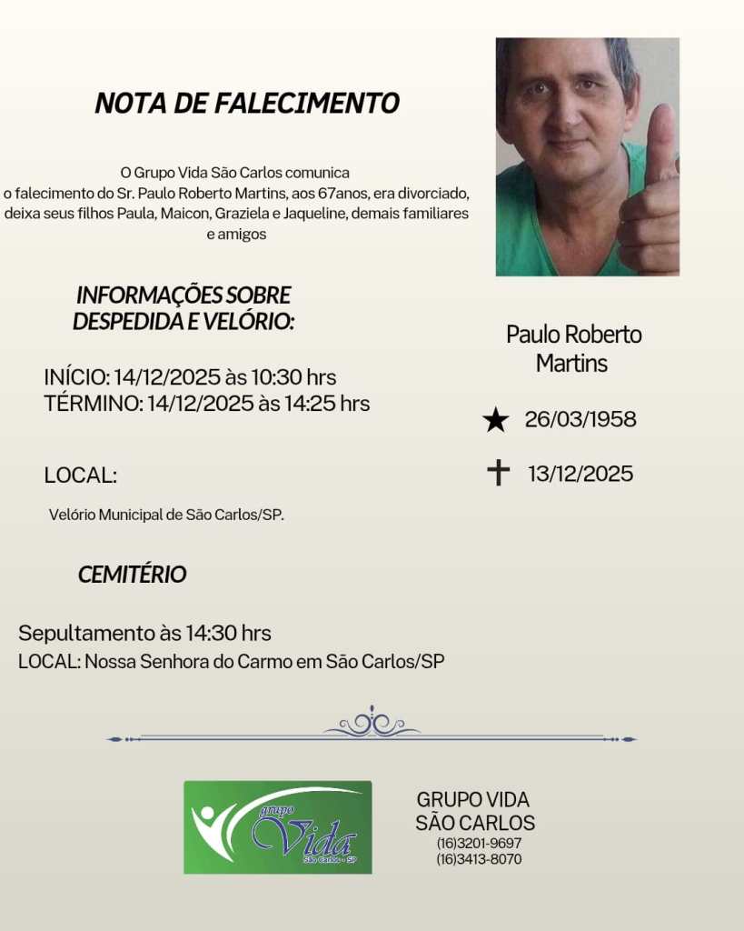 Notícias O falecimento, aos 67 anos, de Paulo Roberto Martins Por renatochimirri - 14 de dezembro de 2025 Share Facebook Twitter Pinterest WhatsApp