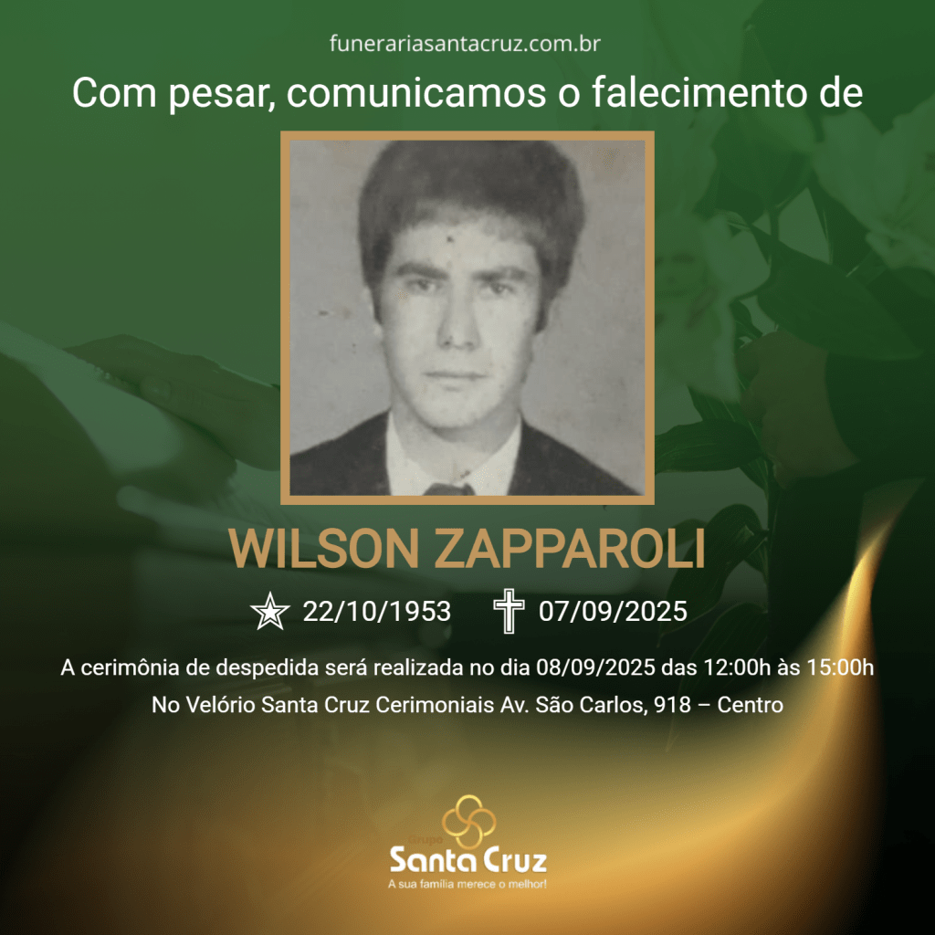 É com profundo pesar que o Grupo Santa Cruz comunica o falecimento do Sr. Wilson Zapparoli, aos 71 anos, ocorrido em 07/09/2025, na cidade de São Carlos.