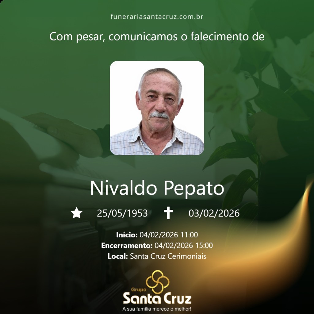 É com profundo pesar que o Grupo Santa Cruz comunica o falecimento do Sr. Nivaldo Pepato, aos 72 anos, ocorrido no dia 03/02/2026, na cidade de São Carlos.