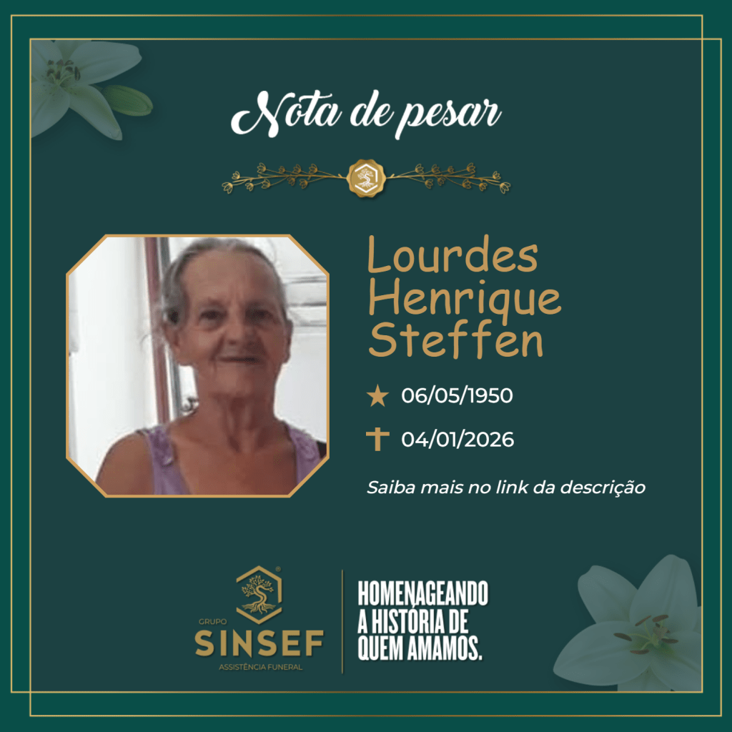 A família de Lourdes Henrique Steffen comunica, com pesar, o seu falecimento. O Grupo SINSEF teve a honra de prestar a última homenagem no dia 04/01/2025.