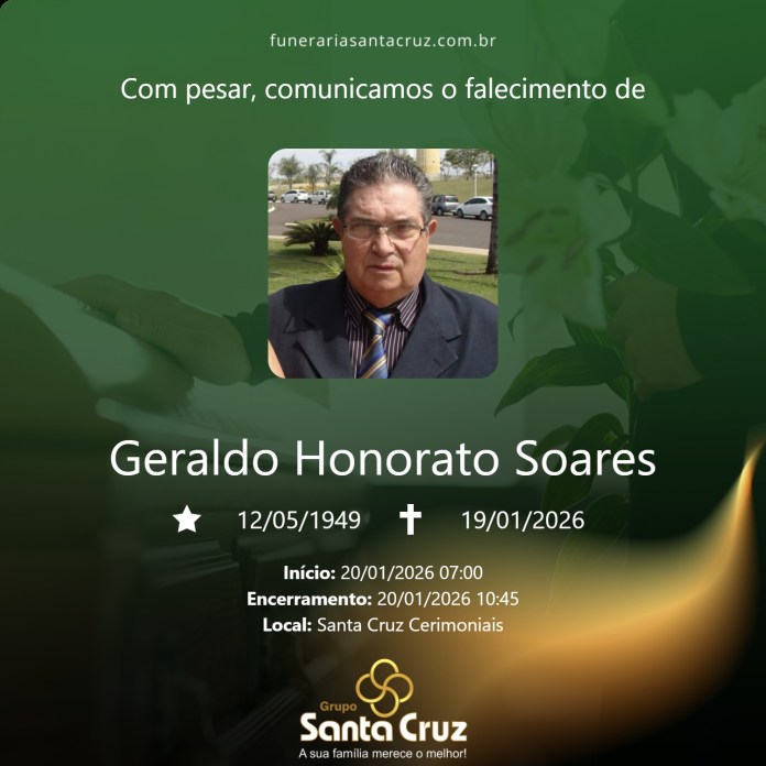 É com grande pesar que o Grupo Santa Cruz comunica o falecimento do Sr. Geraldo Honorato Soares, aos 76 anos de idade, ocorrido no dia 19/01/2026, na cidade de São Carlos.