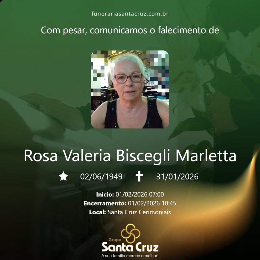 É com grande pesar que o Grupo Santa Cruz informa o falecimento da Sra. Rosa Valéria Biscegli Marletta, aos 76 anos, ocorrido no dia 31/01/2026, na cidade de São Carlos.