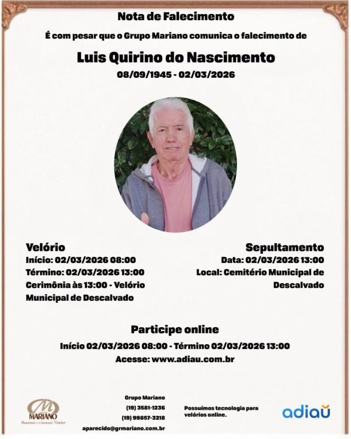 O Sr. Luis Quirino do Nascimento será velado no dia 02/03/2026, a partir das 8h, no Velório Municipal, localizado à Rua Coronel Manoel Leme, nº 50, Centro, Descalvado.