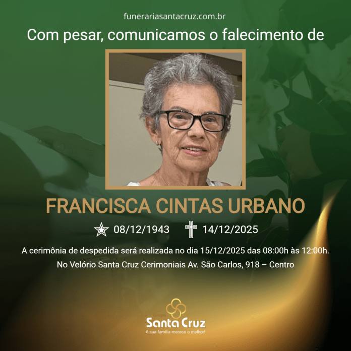 É com grande pesar que o Grupo Santa Cruz informa o falecimento da Sra. Francisca Cintas Urbano, aos 82 anos de idade, ocorrido no dia 14/12/2025, na cidade de São Carlos.
