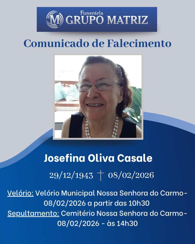 É com imenso pesar que comunicamos o falecimento da Sra. Josefina Oliva Casale, ocorrido no dia 08 de fevereiro de 2026, em São Carlos (SP), aos 82 anos.