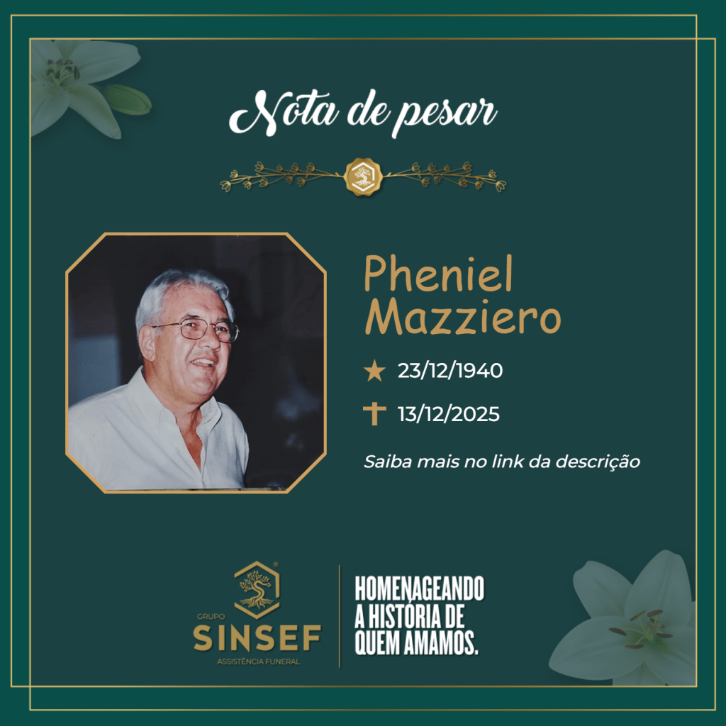 A família de Pheniel Mazziero comunica, com pesar, o seu falecimento. O Grupo SINSEF teve a honra de realizar a última homenagem no dia 14/12/2025, no Memorial SINSEF – São Carlos. A todos que partilharam com ele os caminhos da vida, entre alegrias e desafios, fica o mais sincero agradecimento.
