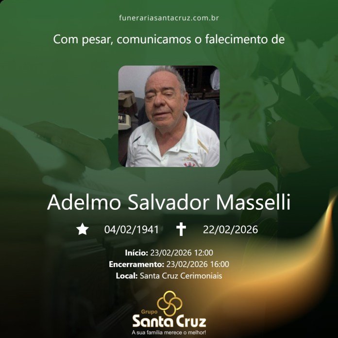 É com grande pesar que o Grupo Santa Cruz comunica o falecimento do Sr. Adelmo Salvador Masselli, aos 85 anos, ocorrido no dia 22/02/2026, na cidade de São Carlos.