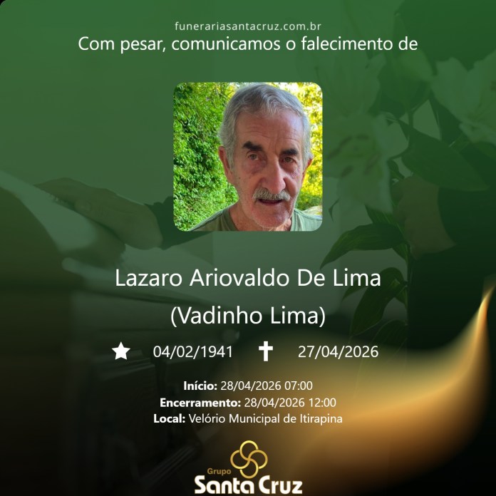 É com grande pesar que o Grupo Santa Cruz informa o falecimento do Sr. Lázaro Ariovaldo de Lima, aos 85 anos, ocorrido no dia 27/04/2026, na cidade de Itirapina (SP).