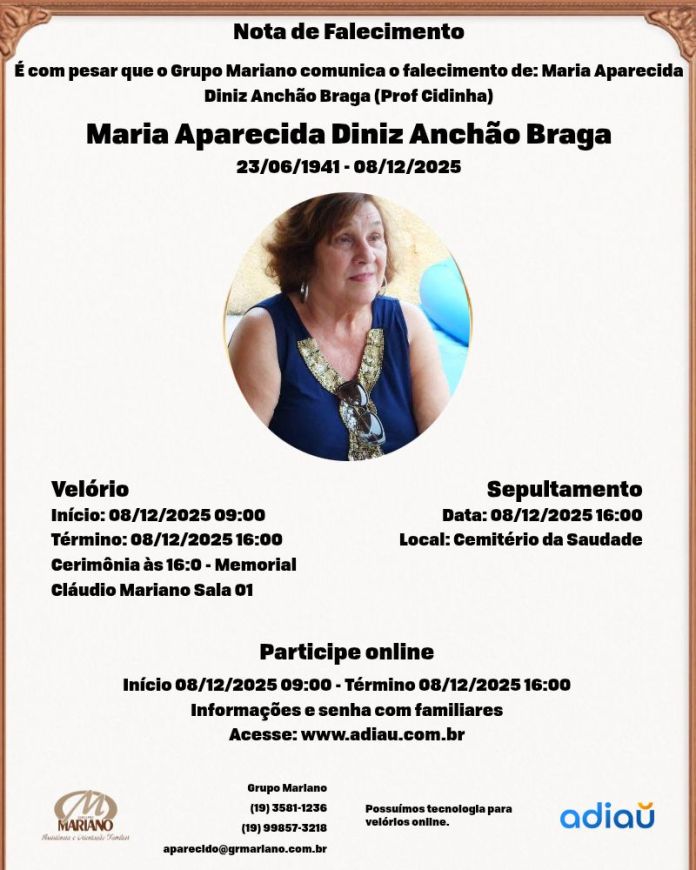 A Funerária Grupo Mariano (Santa Catarina), com profundo pesar, comunica o falecimento da Sra. Maria Aparecida Diniz Anchão Braga (Profª Cidinha), aos 85 anos. Viúva, deixa os filhos André Luis, Renata, Daniela e Tatiana, além de netos, demais familiares e amigos.