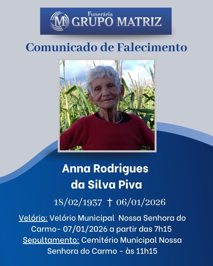 É com imenso pesar que comunicamos o falecimento da Sra. Anna Rodrigues da Silva Piva.