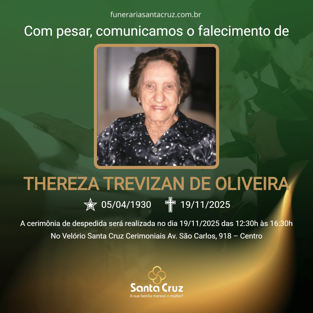 É com grande pesar que o Grupo Santa Cruz informa o falecimento da Sra. Thereza Trevizan de Oliveira, aos 95 anos de idade, ocorrido no dia 19/11/2025, na cidade de São Carlos.