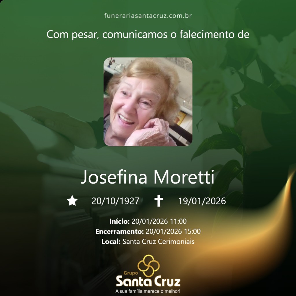 É com grande pesar que o Grupo Santa Cruz comunica o falecimento da Sra. Josefina Moretti, aos 98 anos de idade, ocorrido no dia 19/01/2026, na cidade de São Carlos.